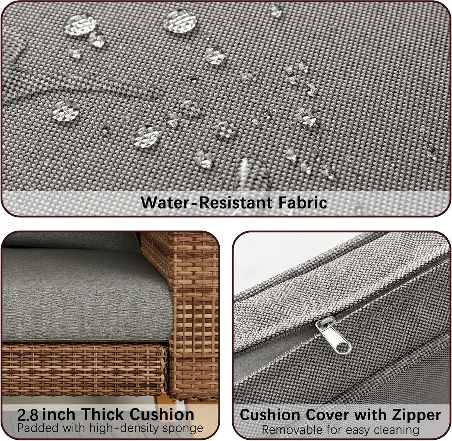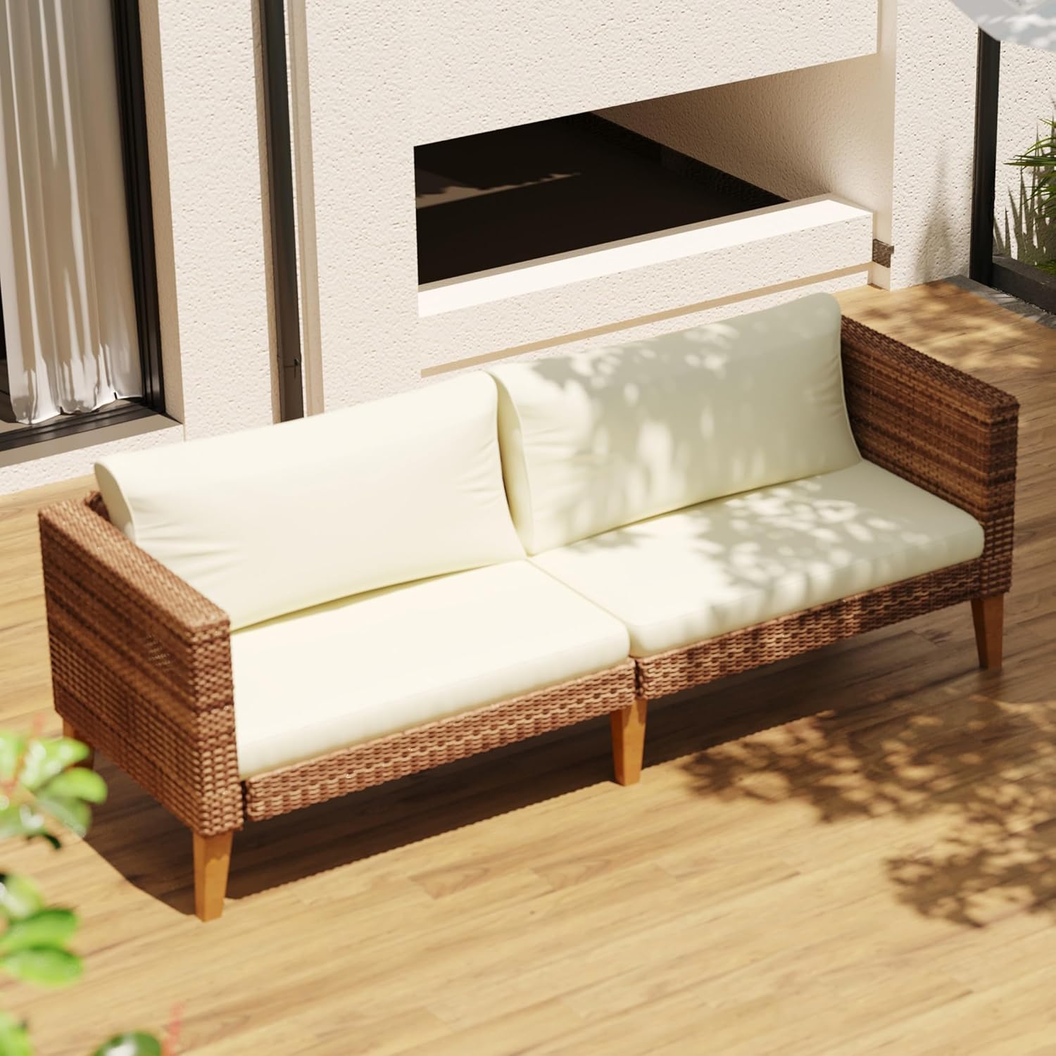 Our outdoor loveseat features durable PE wicker, and six solid acacia wood legs for excellent stability. With thick cushions, removable covers, and weather-resistant materials, it offers lasting comfort and style. Its compact design seats up to four, perfect for patios, porches, decks, or balconies.